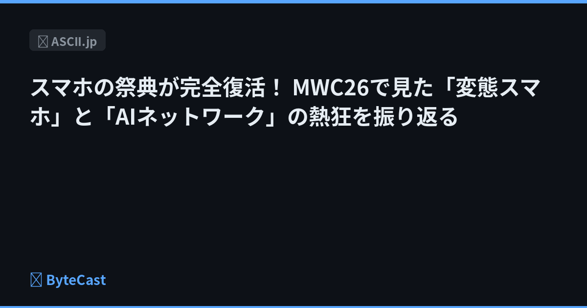MWC26を取材したASCII.jpチーム4名による振り返り 。今年は多彩な新スマホが登場して「スマホの祭典」が復活 。一方で通信インフラは5GからAIと6G中心へとシフトし、エージェントAIやフィジカルAI(ロボット)、衛星通信が当たり前になる未来の到来を実感する内容となっています 。