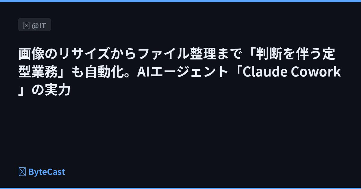 PC内のファイルを直接操作できるAIエージェント「Claude Cowork」が登場した。従来のAIチャットと異なり、ローカルのサンドボックス環境で自律的に作業をこなすのが特徴だ。本Tech TIPSでは、導入に必要なハードウェア要件から、画像一括リサイズなどの具体的な自動化事例までを解説する。