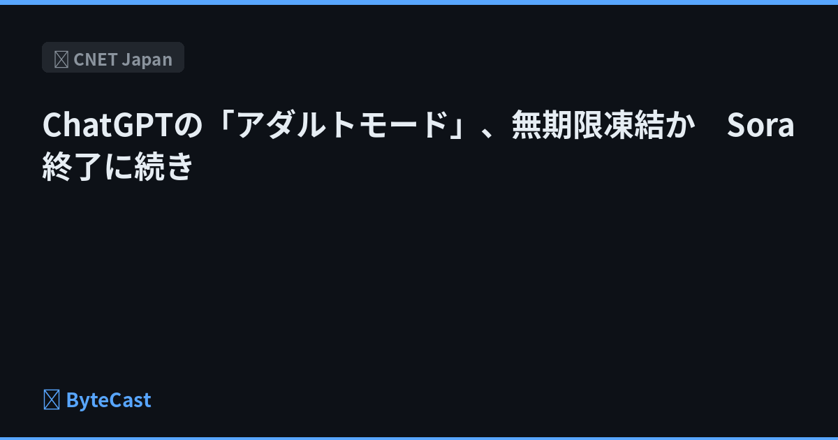 OpenAIが、ChatGPT向けに検討していた成人向けチャット機能の開発を無期限で凍結したと報じられた。動画生成ツール「Sora」の終了に続く方針転換とみられる。