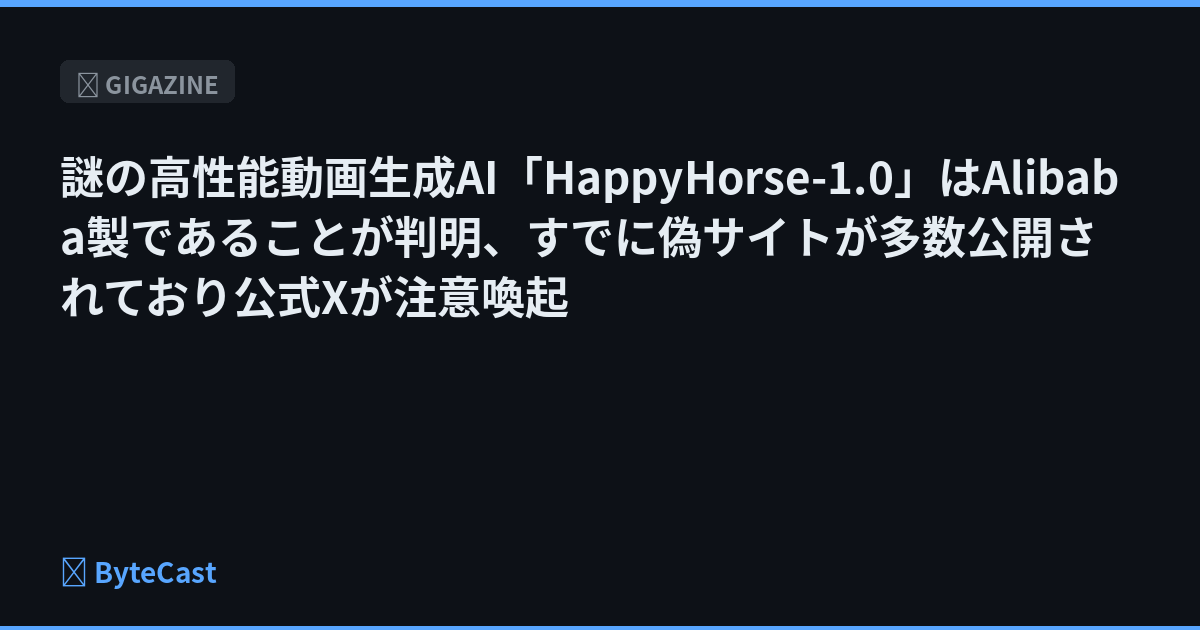 謎の高性能動画生成AI「HappyHorse-1.0」はAlibaba製であることが判明、すでに偽サイトが多数公開されており公式Xが注意喚起