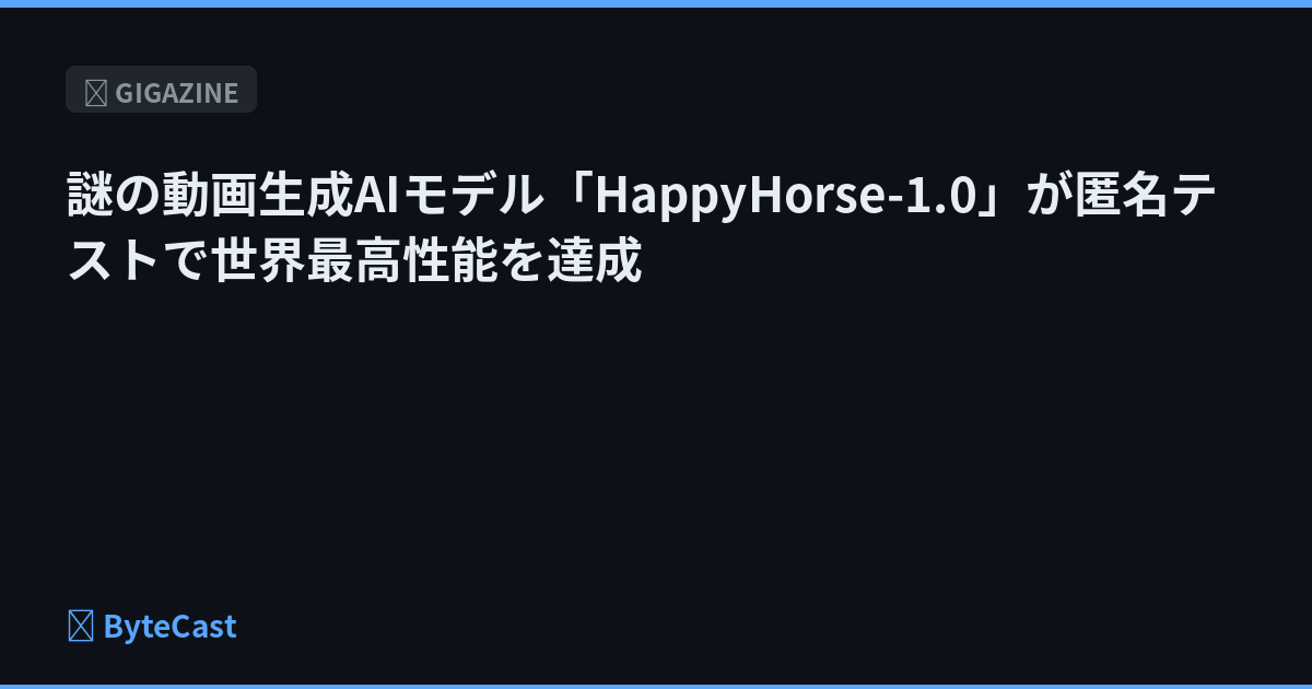 AI情報分析サイト「Artificial Analysis」の動画生成AI性能ランキングに「HappyHorse-1.0」という名前のモデルが登場し、GoogleやByteDanceなどの高性能モデルを抜いてランキング1位の座を獲得しました。
