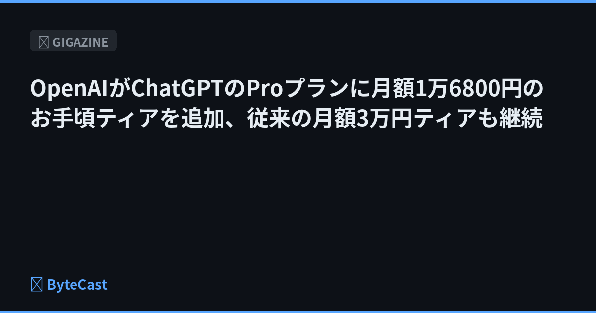 OpenAIがChatGPTのProプランに月額1万6800円のお手頃ティアを追加、従来の月額3万円ティアも継続