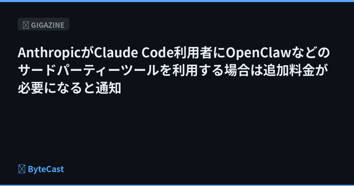 Anthropicが有料会員向けに提供しているAIコーディングアシスタントがClaude Codeです。AnthropicはClaude CodeをOpenClawなどのサードパーティー製ツールと併用する場合、追加料金が必要になるとユーザーに通知していることが明らかになりました。