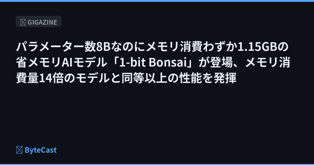 パラメーター数8Bなのにメモリ消費わずか1.15GBの省メモリAIモデル「1-bit Bonsai」が登場、メモリ消費量14倍のモデルと同等以上の性能を発揮