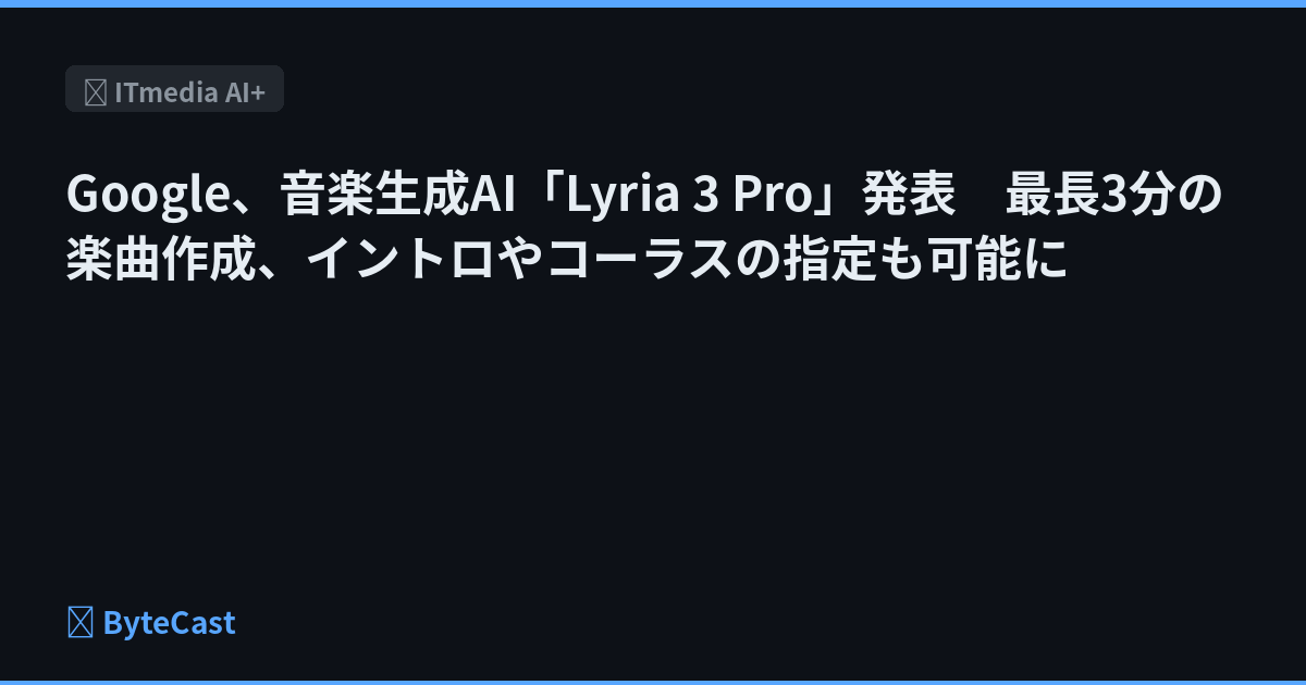 Googleは、音楽生成モデル「Lyria 3」の高度版「Lyria 3 Pro」を発表した。最長3分間の楽曲作成が可能で、構成指定などの制御性が向上している。Geminiアプリでは「Pro」以上で、Vertex AI、Google AI Studio、Google Vids等でも順次提供していく。