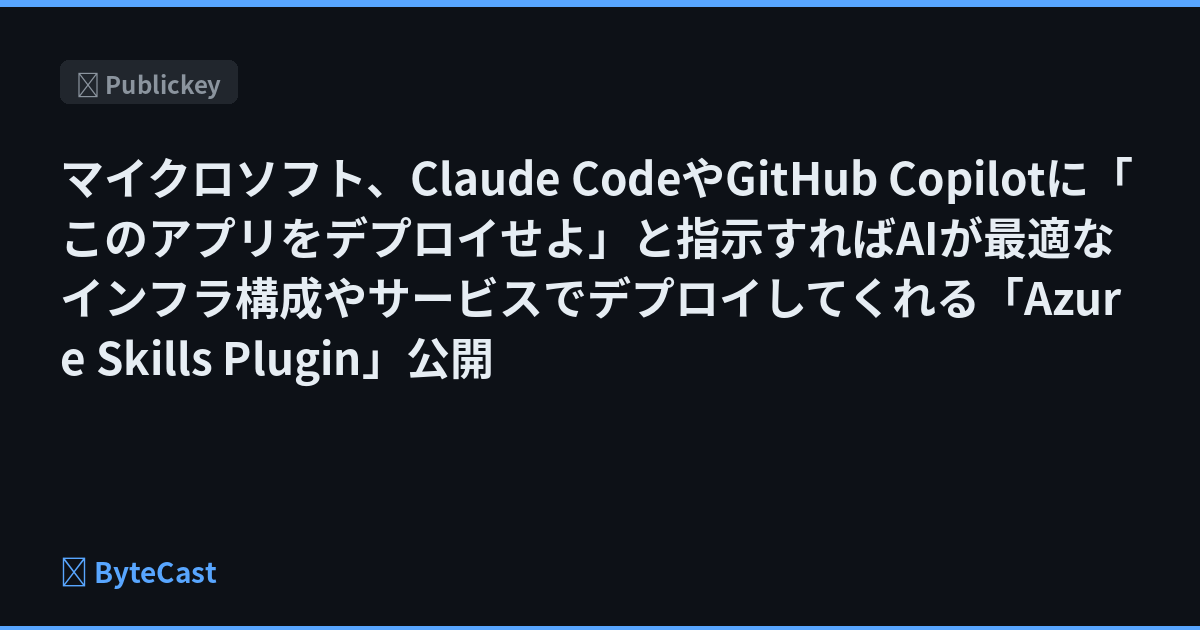 マイクロソフト、Claude CodeやGitHub Copilotに「このアプリをデプロイせよ」と指示すればAIが最適なインフラ構成やサービスでデプロイしてくれる「Azure Skills Plugin」公開