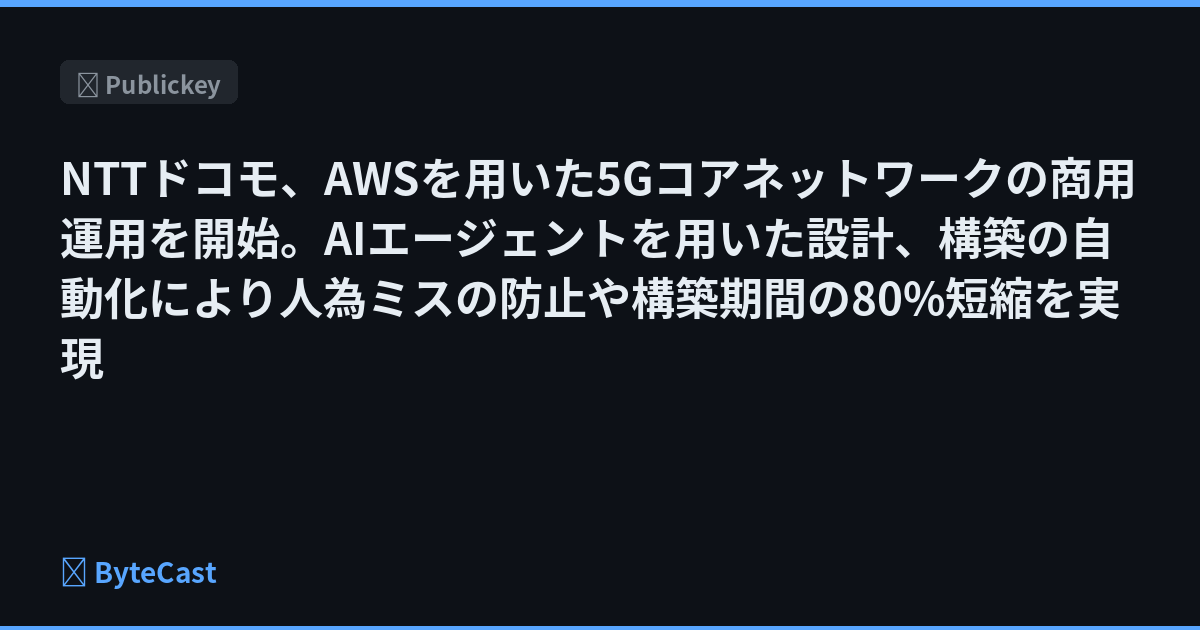 NTTドコモ、AWSを用いた5Gコアネットワークの商用運用を開始。AIエージェントを用いた設計、構築の自動化により人為ミスの防止や構築期間の80%短縮を実現