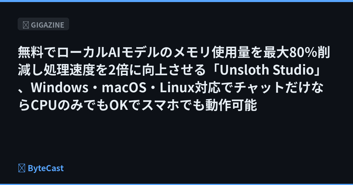 無料でローカルAIモデルのメモリ使用量を最大80%削減し処理速度を2倍に向上させる「Unsloth Studio」、Windows・macOS・Linux対応でチャットだけならCPUのみでもOKでスマホでも動作可能